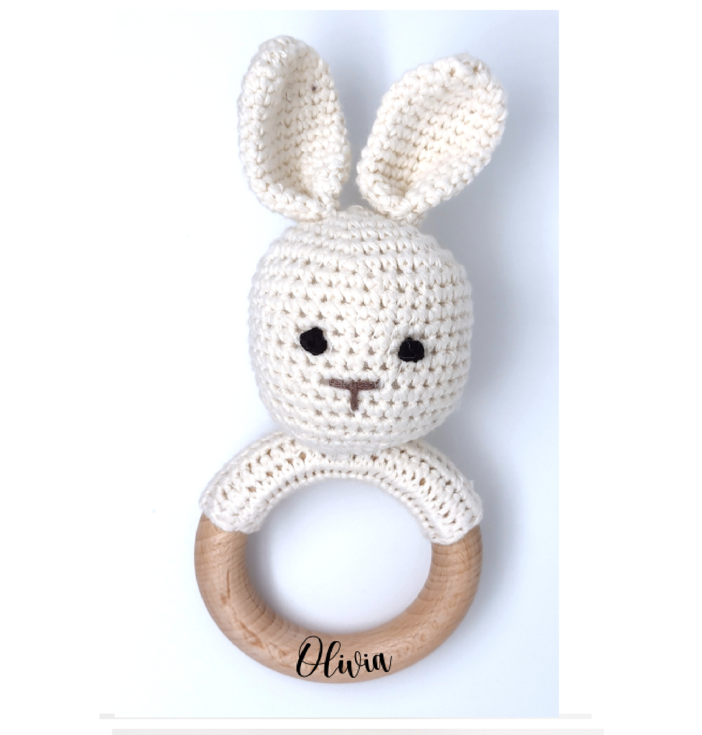 Handmade Bunny - Rabbit Teether / Rattle (Name or Name + DOB) Personalised