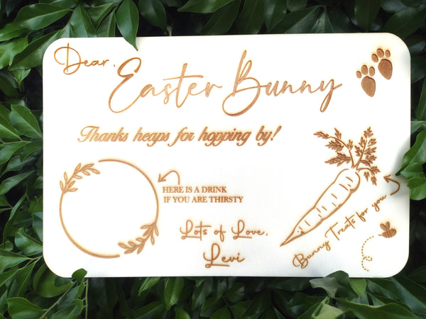 This Personalised Easter Bunny tray features a beautiful design to place your favourite carrot for the Easter Bunny and even has a great little spot to place some yummy milk.