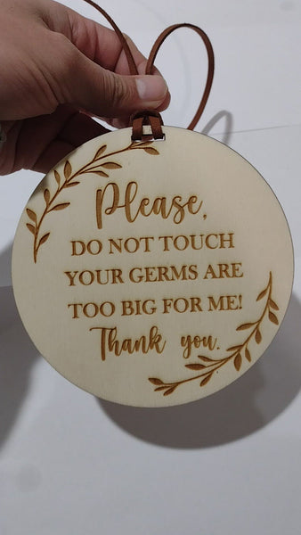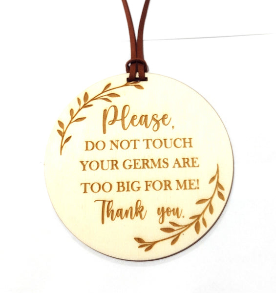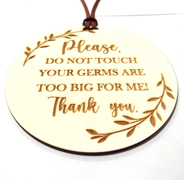 "Please, do not touch your germs are too big for me. Thank you" comes in a variety of sizes.